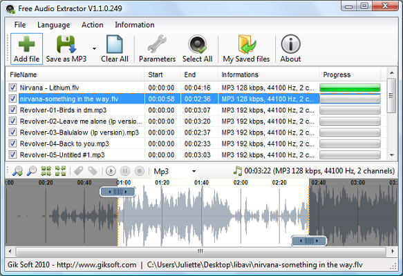 Free Audio Extractor birçok farklı dosya biçimini destekleyen bir ses ayıklama programı,videolardaki sesleri Mp3, Wav, Wma, Ogg, Flac ses biçimleri olarak kayıt etmenizi sağlıyor.