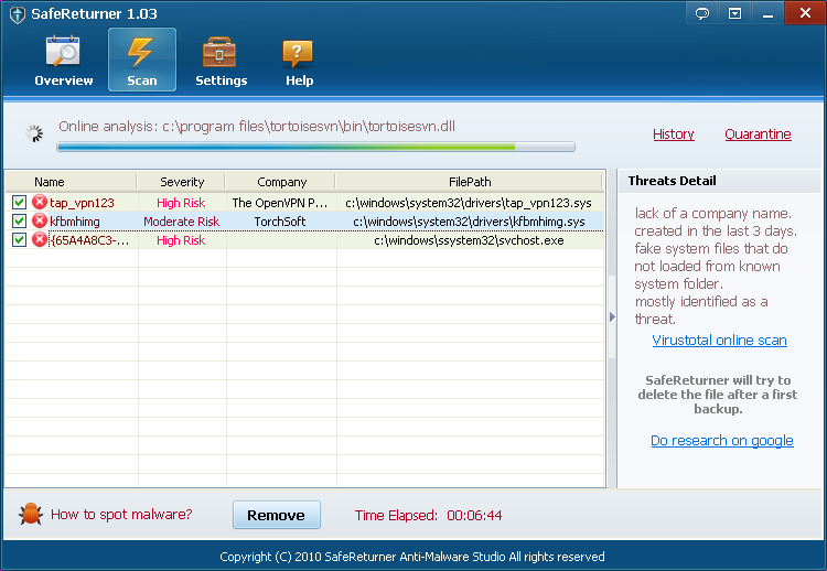 Safe Returner Truva Atları, solucanlar, Adware, Spyware gibi kötü amaçlı yazılımları tespit eden ve bunları kaldırmanızı sağlayan bir güvenlik uygulamasıdır 29,95 $ değerindeki yazılımın 1 yıl süreli kampanya