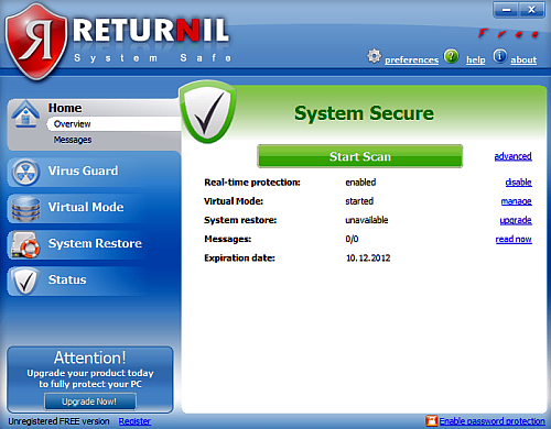 Returnil System Safe bir güvenlik uygulaması bilgisayarınıza bulaşmaya çalışan virüsleri Anti-malware ve anti-spyware gibi kötü niyetli yazılımları gerekli gerçek zamanlı koruması ile sisteminizden uzak tutuyor ayrıca