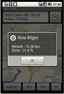 Taksi Taxi uygulaması iki koordinat arasındaki rotayı çizip, taksi ücretinin ne kadar tuttuğunu ve mesafeyi hesaplıyor.