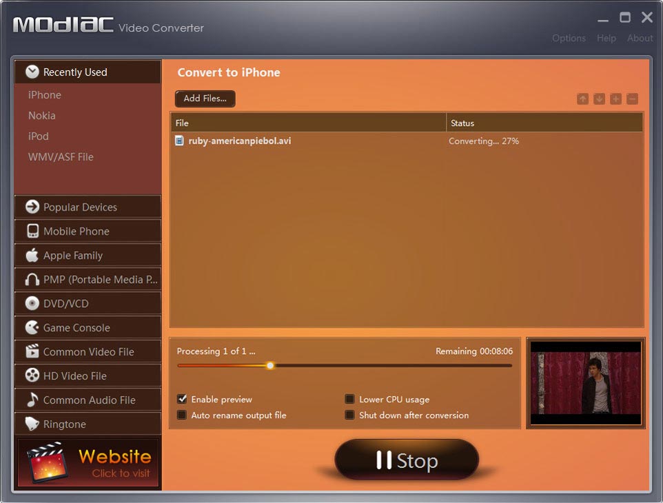 Modiac Video Converter ile, WMV, DVD, AVI, MKV, MP4 ve , AVI, MKV, WMV, MPEG, DVD gibi hemen hemen bütün popüler formatları dönüştürmek mümkündür. Aynı zamanda, iPod, iPhone, iPad, PSP, Zune, NDS, Xbox 360, PS3, cep telefonları, gibi tüm ortak konsolları destekler ve aralarında serbestçe dosyaları dönüştürmenizi sağlar.