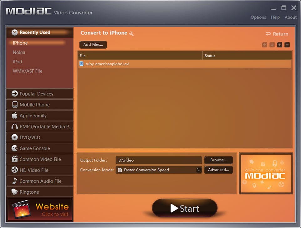Modiac Video Converter günümüzün mevcut en güçlü ve yüksek hızda video dönüştürücü programdır. Tüm popüler video AVI, MP4, MKV, FLV, WMV gibi formatlı videoları dönüştürebilirsiniz. Gerektiğinde iPod, iPhone, iPad, PSP, Zune, NDS, Xbox 360, PS3, cep telefonları gibi yeni nesil konsollar ve birden çok mobil cihazlar tarafından desteklenen çeşitli biçimlerde PC’nizde videolardan, ses ayırmak için kullanabilirsiniz.