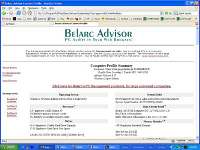Belarc Advisor detaylı şekilde, profil yüklü yazılım ve donanım, ağ envanteri, eksik Microsoft düzeltmeleri, anti-virüs durumu, güvenlik kriterleri oluşturur, ve Web tarayıcınızda sonuçları görüntüler . Ayrıca PC profil bilgilerinizi bilgisayarınızda gizli tutar ve herhangi bir web sunucusuna gönderilir.