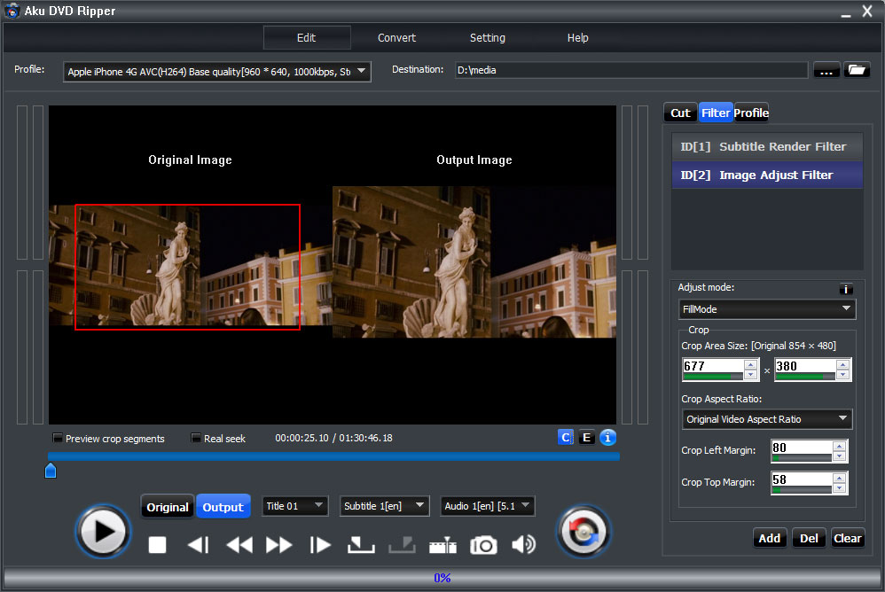 Aku DVD Ripper tüm özellikleri ile üstün ve kaliteli bir programdır. DVD filmlerinizi kesip, kırpabilir ve bunun gibi birçok düzenleme fonksiyonlarını kullanabilirsiniz. DVD filmlerinizin çözünürlüğü, altyazı, bit hızı, kare oranı, renk, renk tonu, parlaklık, doygunluk, ses kanalı vb. gibi video ayarlerını yapabilirsiniz. Aku DVD Ripper kesinlikle tüm seviye kullanıcılar için DVD filmlerini düzenleyen büyük bir yardımcıdır.