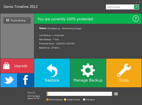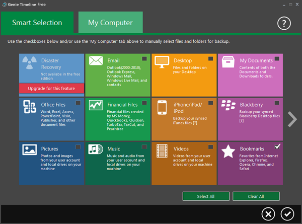 Genie Timeline Free 2012, yeni Metro tarzı akıllı seçim ekranıyla Office dosyalarınızı, e-postalarınızı, yer imlerinizi, videolarınızı, resimlerinizi ve daha pek çok verinizi yedeklemenizi sağlayan ücretsiz bir programdır. İstediğiniz dosya türünü seçmenize imkân tanır. Yedekleme hızı konusunda bir önceki sürümüne göre iki kat daha hızlı yedekleme yapabilir.