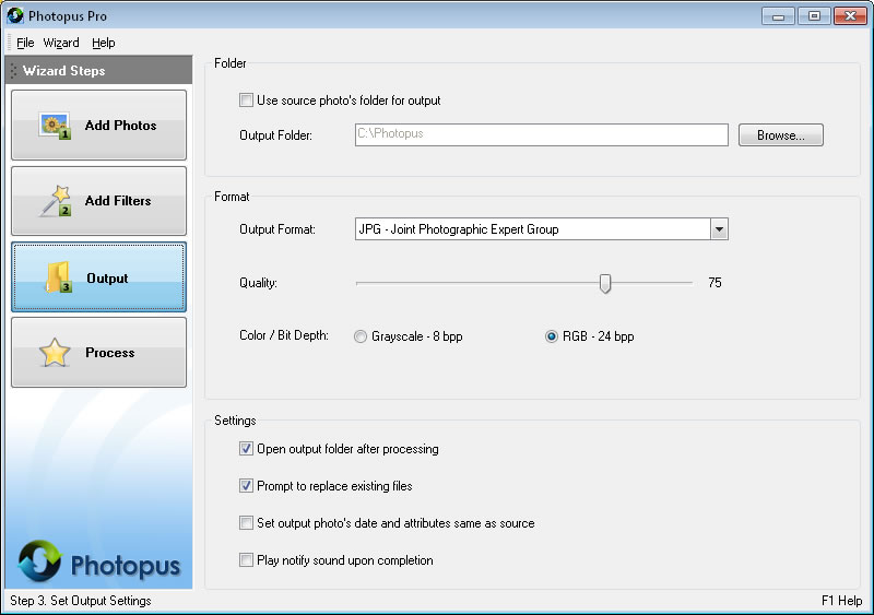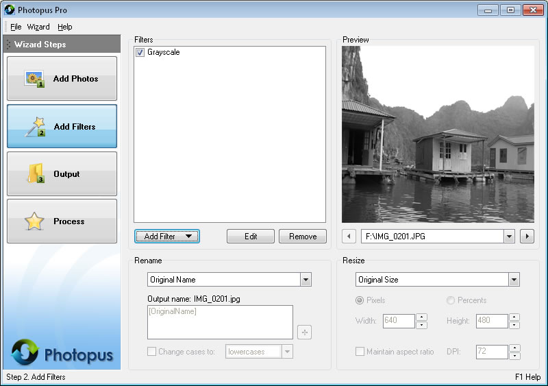 Sadece görüntüleri işlemek için 3 adımlı Sihirbaz stili: Resim ekleme, Çıkış Filtreler ekleyin.