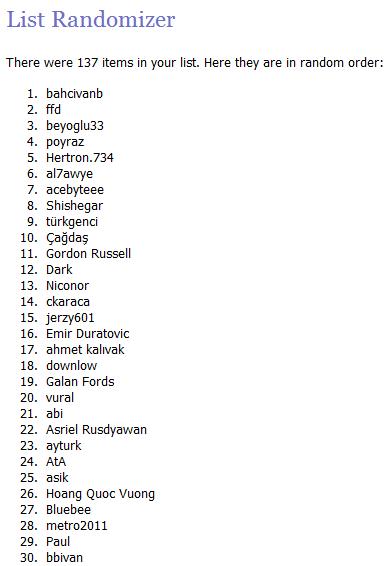 1-bahcivanb 2-ffd 3-beyoglu33 4-poyraz 5-Hertron.734 6-al7awye 7-acebyteee 8-Shishegar 9-türkgenci 10-Çağdaş 11-Gordon Russell 12-Dark 13-Niconor 14-ckaraca 15-jerzy601 16-Emir Duratovic 17-ahmet kalıvak 18-downlow 19-Galan Fords 20-vural 21-abi 22-Asriel Rusdyawan 23-ayturk 24-AtA 25-asik 26-Hoang Quoc Vuong 27-Bluebee 28-metro2011 29-Paul 30-bbivan