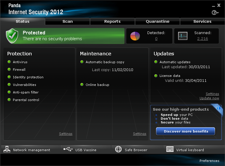 Panda Internet Security 2012, tam bir iç huzuruyla İnternet kullanımı sağlayan bir güvenlik paketidir. Virüs, casus yazılım, rootkit, çevrimiçi dolandırıcılığı, kimlik hırsızlığı ve diğer İnternet tehditlerine karşı sizi korur.