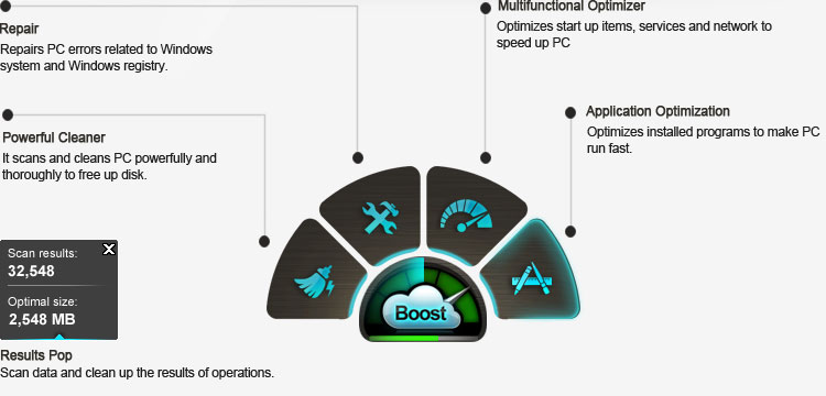 Bilgisayarı temizleme, bilgisayar hatalarını tamir etme ve Sistem optimizasyonu Anvisoft tarafından sağlanan tek tıklama ile çözümü kavuşması hiçte zor değildir. Tarama ve temizleme modülleri olduğu gibi kendi isteğiniz doğrultusunda tanımlanmış ayarlar ile optimize ve tamir yapabilirsiniz. Eğer deneyimsizseniz tam bilgisayar temizlemesini çalıştırmak için Boost düğmesine tıklayabilirsiniz. Her ayarı kendi yaparak sorunsuz temizliğe başlar.