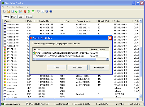 SterJo NetStalker, yenilikçi ve ücretsiz bir güvenlik yazılımıdır. Bilgisayarınızdaki tüm yetkili ve yetkisiz bağlantıları algılayabilir ve her yeni bağlantı için sizi uyarabilir. Programın işlevi çoğu güvenlik duvarının çalışması gibi benzer prensiplere dayanmaktadır. Ayrıca tamamen taşınabilir sürümü de mevcuttur. Böylece kuruluma gerek duymaz bir tıklamayla çalıştırabilirsiniz. Standart bir port tarayıcı ile sisteminizdeki tüm açık portları bulabilirsiniz. Aynı zamanda sistem üzerinde çalışan tüm süreçlerin analizinin yanı sıra şüpheli işlemleri bulma konusunda oldukça güçlü bir yazılımdır.