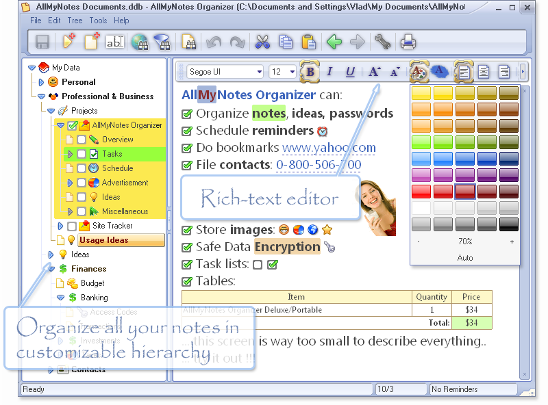 AllMyNotes Organizer sayesinde bütün notlarınızı güvenle saklayabilirsiniz. Kolayca ulaşabileceğiniz bir şekilde, bir arada ve şifreli tutulan notlarınızı esnek bir ağaç dalları düzeninde tutmanız mümkündür. Fikirlerinizi, yapılacak işleri ve günlük notlarınızı tutmayı bu uygulama ile keyifli hale getirin..vladonai.com sponsorluğunda softpedia.com okuyucularına 24 saat için AllMyNotes Organizer Deluxe 2.68 hediye ediyor ,kişisel kullanım için ücretsiz ve yükseltme barındırmıyor bilginize…