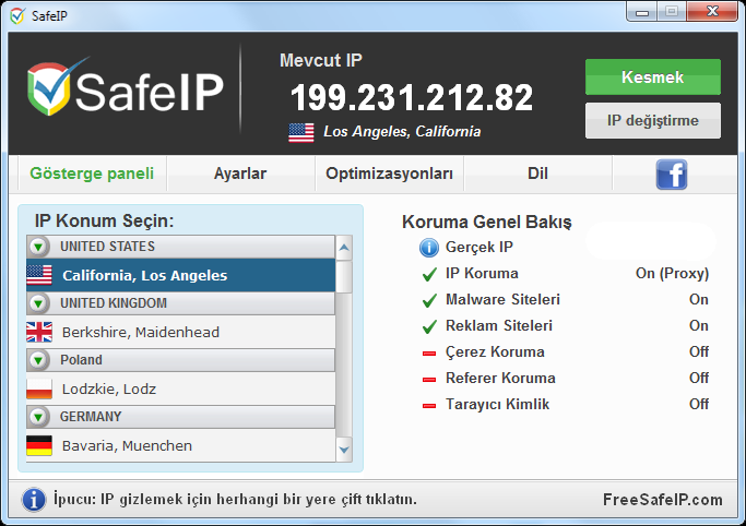 IP adresinizi gizleyin ve SafeIP ile online kimliğinizi koruyun. SafeIP çevrimiçi sörf yaparken sizin gerçek IP adresinizi gizlemenize olanak sağlayan basit ve çok dilli (Türkçe dahil) bir uygulamadır. Bu araç yardımı ile anonim gezinebilir ve belirli web sitelerinin erişim engellemesini kaldırabilirsiniz. Farklı yerlerden çeşitli proxy sunucularını seçerek kullanabilirsiniz.