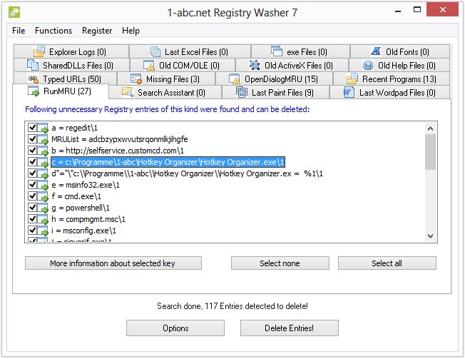 Windows Kayıt Defteri tüm programlar için en önemli yapılandırma yeri ve verilerin tutulduğu bir merkezdir. Bilgisayarınızı başlattığınızda, Windows her zaman yüklü tüm yazılımları, yerel ayarları, program yollarını, son açılan belgeleri, belirli kullanıcı seçeneklerini ve daha fazlasını bildirmek için kayıt defterini denetler. Ancak sistemden kandırılan programlar, bazı uygulamalar vb. gibi işlemler kayıt defterinde kalıntılar ve sorunlar oluşturabilir. Programların veya sistemin eski kalıntı verileri, bilgileri ve gereksiz girdileri bilgisayarınızı yavaşlatır. 1-abc.net Registry Washer Registry ise kayıt defterindeki oluşan tüm bu sorunları ortadan kaldırılabilir. Kayıt defterindeki kalıntıları temizler ve oluşan sorunları düzenler. Sistemin hızlanmasını sağlar. 1-abc.net Registry Washer ayrıca tüm eski verileri silerek gizliliğinizi korumanıza yardımcı olur.