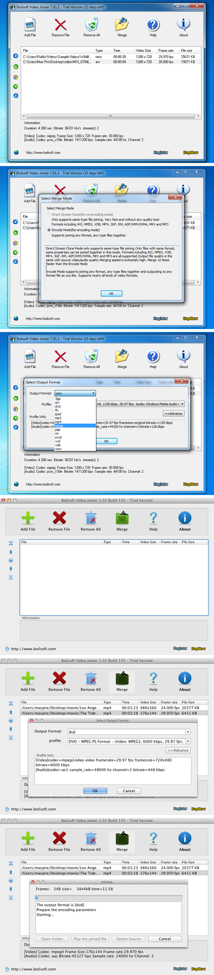 Boilsoft Video Joiner daha verimli ve süper hızda farklı formatlarda (AVI, MPEG, MPG, VOB, RM/RMVB, 3GP, ASF, WMV, WMA, MP4, MP4A, MKV,FLV) videoları birleştirmenizi sağlar.