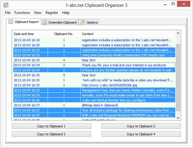 1-abc.net Clipboard Organizer bir panodan çok daha fazladır: Harika bir rapor özelliği sayesinde program aktif olduğu sürece tüm panodaki değişiklikleri görüntüleme sağlar. Hangi metni kopyaladığınız zamanı analiz edebilir ve kolayca tekrar istediğiniz yere yapıştırmalısınız. 4 panodan herhangi birinden silinen içeriği başka panoya ekleyebilirsiniz. Hatta yıllar sonra bile panoya veri alabilirsiniz. Günlük verilerini yerel sisteme kayıt eder.