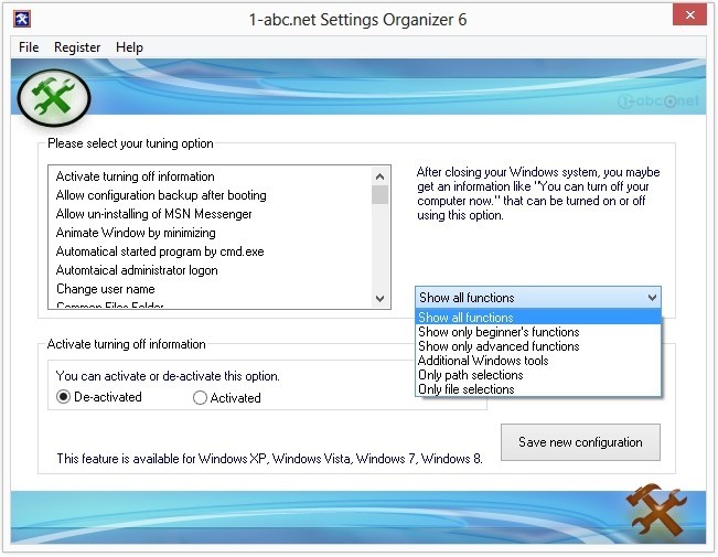 Windows zaman zaman sistem üzerinde bazı kısıtlı değişikliklere izin verebilmektedir. Ancak bunlar genellikle normalde ‘gizli’ olan ve MS Config veya sözde Bilgisayar Yönetim Aracı gibi analiz araçları içerir. Tam ve iyi özellikli yapılandırmalara izin verilmez. 1-abc.net Settings Organizer ise doğru komutlarla tek bir tıklama ile sistem araçların çalıştırmasına izin veriyor.