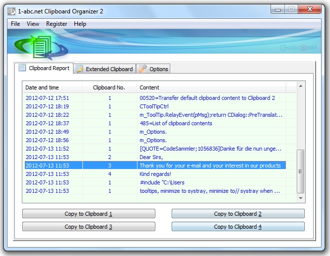Bazen kopyalama ve yapıştırma için farklı metin ve içerikleri farklı panolara aktarma ve düzenleme ihtiyacı duymamıza rağmen, bu tür özellikler sadece bazı ofis araçları için desteklenir ama asla tüm Windows sistemlerde uygulanamaz. 1-abc.net Clipboard Organizer bu eksikliği kapatır ve herkese çok daha fazla pano yönetimi özellikleri sunar. Böylece panoya kopyalanan tüm içerikleri istediğiniz gibi düzenleyebilirsiniz.
