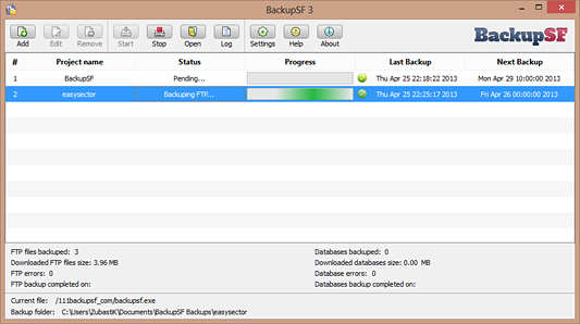 BackupSF, piyasadaki mevcut en iyi otomatik web sitesi yedekleme yazılımlarından birisidir. FTP üzerinden web sitesini yedekler. MySQL veritabanı sunucusuna komut yardımı ile yükleme desteklenmektedir.