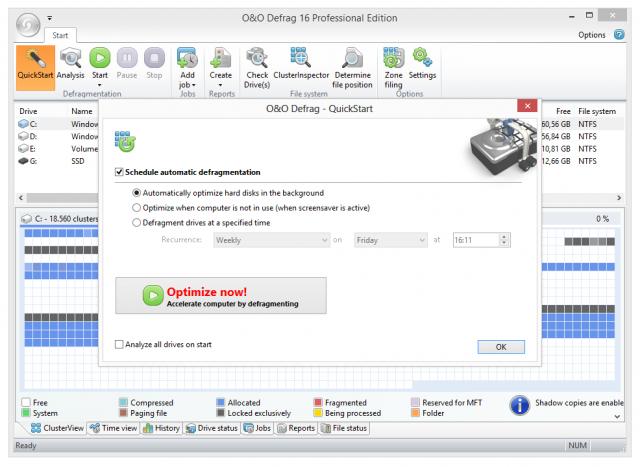O&O Defrag Pro Edition, sabit diskinizi optimize ederek kapsamlı bir yapılandırma ile parçalanmış bölümlerini birleştirir. Sadece programı yükleyin ve varlığını unutun. Program parçalanmış dosyaları otomatik olarak tespit eder ve en kısa sürede onları birleştirerek bilgisayarlarınızı hızlandırır. En iyi sabit sürücü performansını sunmak için arka planda devamlı çalışır.