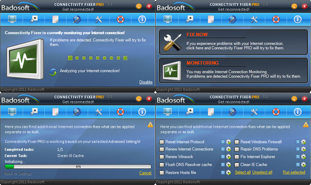 Connectivity Fixer PRO, güçlü bir İnternet bağlantısı onarım ve düzenleme programıdır. İnternette yaşanan sınırlı bağlantı veya bağlantı kesintilerinde, bazı web sayfalarının açılmaması, 404 hatası görüntülenmesi ve IE tarayıcıda oluşan performans sorunlarında size yardımcı olur. Ayrıca virüs, malware, spyware ve adware gibi zararlı yazılımlarının sisteme bulaşmasıyla yaşanan bağlantı sorunlarının giderilmesini sağlar.