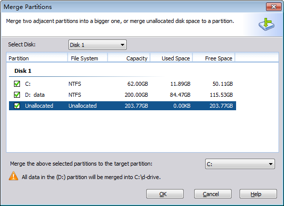 Tam disk alanını kullanmak için boş alanı diğer bir bölüme tahsis.