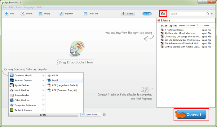 Epubor eBook Converter, E-kitaplarınızı ePUB, PDF, MOBI, AZW, HTMLZ, Topaz, ve PRC gibi bilinen diğer E-kitap biçimlerine dönüştürmenizi sağlar.