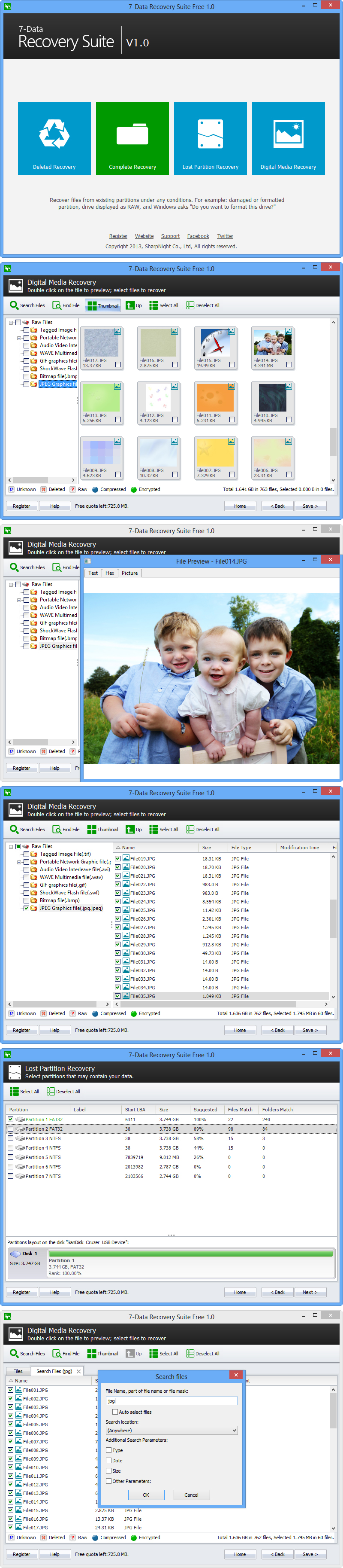 7-Data Recovery Suite, hemen hemen her koşulda önemli dosyalarınızı ve verilerinizi kurtarmak için yetenekli bir veri kurtarma yazılımıdır. Yanlışlıkla silinen dosyaları, hasar görmüş ya da biçimlendirilmiş sabit diskleri, kayıp bölüm /silinmiş, yerel sürücü, bellek kartı veya kameradan silinmiş fotoğraf ve videoları, cep telefonundan silinen özenli verileri geri getirmeyi destekler. Türkçe dil desteği bulunmaktadır.