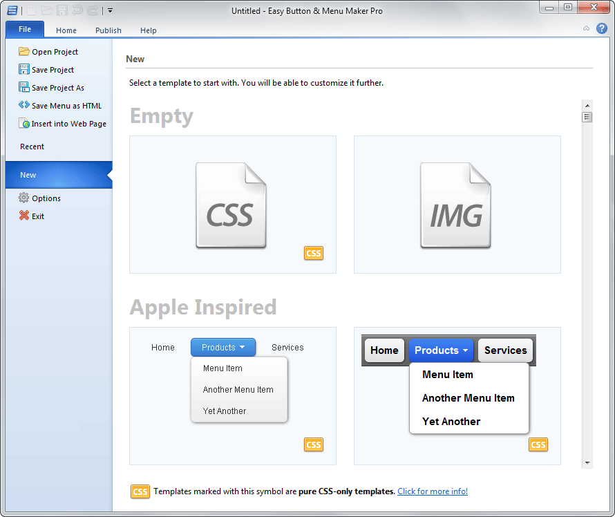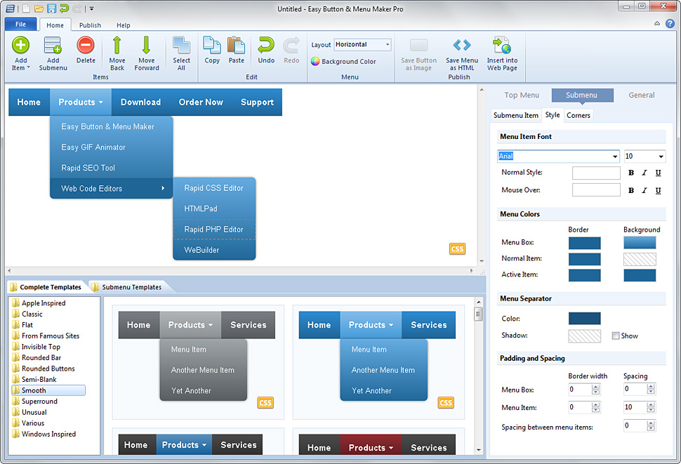 Easy Button & Menu Maker ile kolayca web siteniz için profesyonel dinamik menüler ve görsel düğmeleri sadece birkaç dakika içinde oluşturabilirsiniz. Yazılım, Web siteleri için menü yapımcısı ve düğme üreticisidir. Web sitenizin dakikalar içinde daha iyi görünmesini sağlayın. 200′den fazla zarif tasarım şablonları ve çeşitli moda tasarım stilleri ile en iyisine ulaşın. Easy Button & Menu Maker iki kat fazla sunduğu araçları ile menü ve düğme oluşturmayı tek bir pakette birleştirmiştir. Şimdi saf CSS menü kodları kolayca oluşturabilirsiniz.