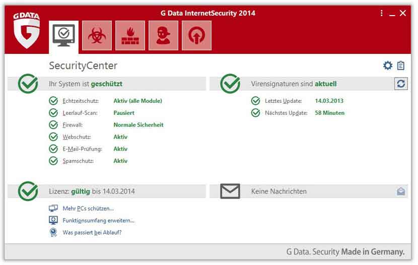 G Data InternetSecurity, kapsamlı virüs koruması sayesinde en yüksek algılama oranlarının yanı sıra bilgisayarın etkinliksiz geçen sürelerinden yararlanmak için yeni Boşta tarama özelliği sunar. Ek olarak, şüpheli dosyaların bulut tabanlı sınama toplamı karşılaştırması ve sessiz güvenlik duvarı sayesinde, performans kaybına ve sıkıcı sorulara yol açmadan virüslere, solucanlara, Spam ve Hacker saldırılarına karşı mükemmel savunma elde edersiniz. Bir ebeveyn kontrolü sayesinde ek koruma sunar.