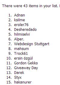1-Adnan 2-ksilme 3-eroler76 4-Desheredado 5-hilmiselvi 6-Alper. 7-Webdesign Stuttgart 8-mahsum 9-Trock61 10-ersin özgül 11-Gordon Gekko 12-Giveaway Day 13-Darek 14-Styx 15-hakanurer