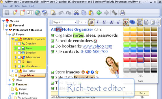 AllMyNotes Organizer sıralama olmadan büyük miktarda bilgiyi alıp kategorize etmenize ve hassas bilgiye şifre ile ulaşmanıza, hepsinin arasından istediğinizi arayıp anında kolayca bulmanıza yardımcı bir programdır. AllMyNotes Organizer sıralamasız bilgi yönetimine yeni bir alternatif yaklaşımdır.
