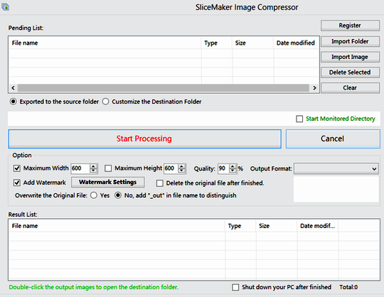 SliceMaker Image Compressor kalite kaybı olmadan % 65 oranında görüntü ve fotoğrafların dosya boyutunu azaltmanıza izin verir. Ayrıca kolayca dönüştürme, boyutlandırma ve filigran eklemenizi sağlar.