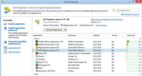 Soft Organizer, Microsoft Windows sürümlerini (XP - 8.1)destekleyen basit ve mükemmel bir program kurulum ve kaldırma yardımcısıdır, program izleme olmadan bile yüklenen programların izlerini bulmak için özel bir mekanizma ile donatılmıştır. Sistemde yüklü neredeyse her uygulama için komple kaldırma olanağı sağlar ve böylece gereksiz dosyalar tarafından Windows’un darmadağın olmasını engeller.