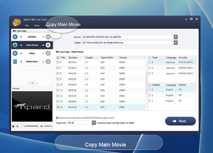 Tipard Blu-ray Copy, DRM korumalı TV şovlar ve filmler de dahil olmak üzere Blu-ray diskleri kopyalamanıza izin verir. Blu-ray Disc veya Blu-ray klasör / ISO dosyaları olarak sabit diskinize sıfır kalite kaybı ile yedekleme yapabilirsiniz. Ayrıca Blu-ray içeriklerinizi kolayca yazdırabilirsiniz…