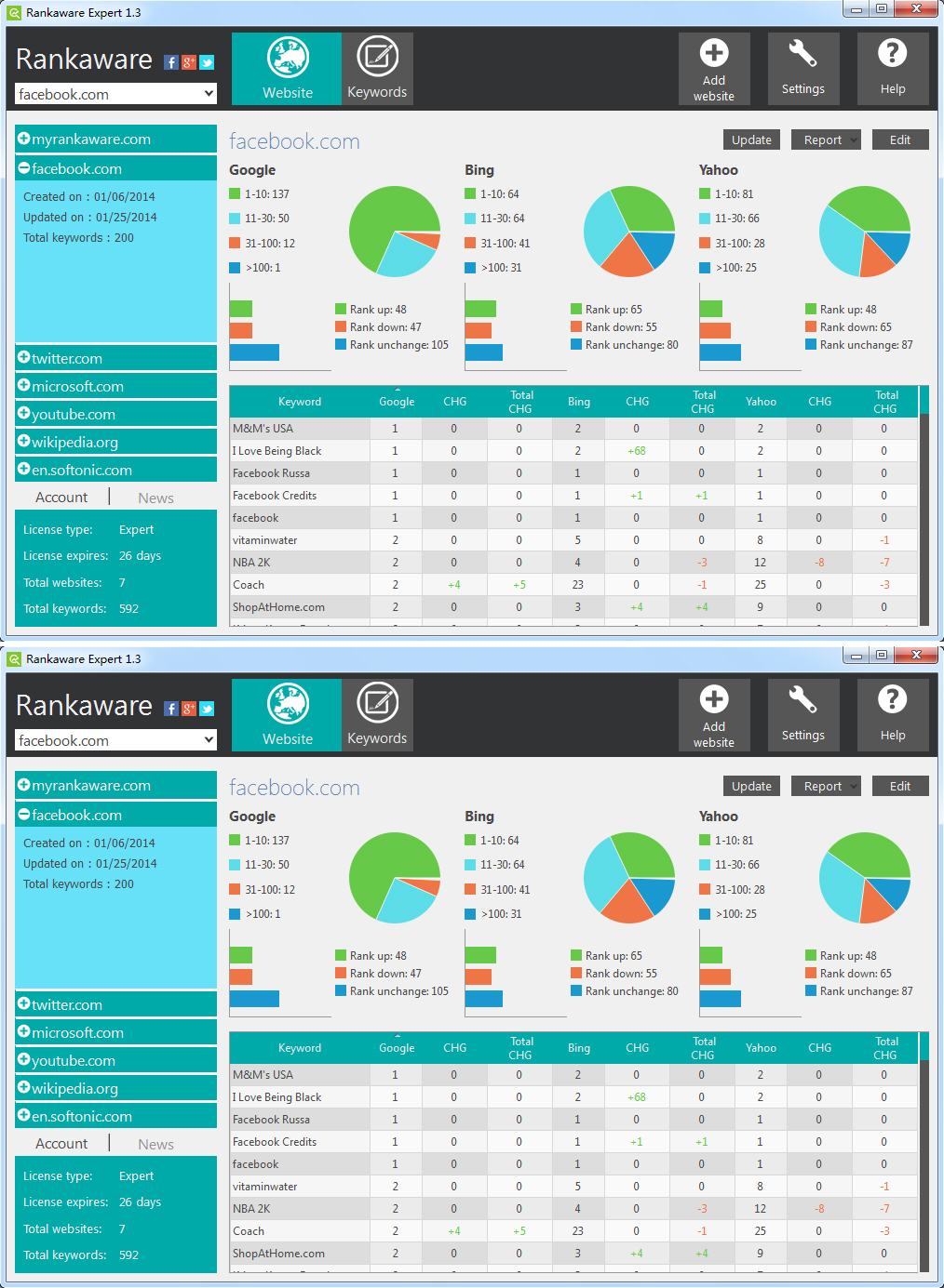 Rankaware, size çeşitli arama motorlarında web sitenizin sıralaması için gereken SEO özelliklerini sunması için tasarlanmış kullanımı kolay ve güvenilir bir programdır. Rankaware, kullanıcı tanımlı anahtar kelimelerle, çeşitli arama motorları olan Google, Yahoo! ve Bing sayfalarında çeşitli sitelerin sıralamalarını izlemenize olanak sağlayan sezgisel ve etkin bir SEO aracıdır.