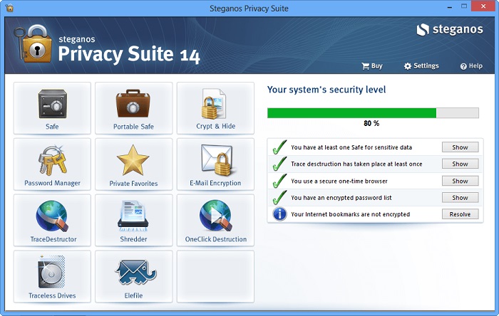 Steganos Privacy Suite, programı önemli dosyalarınızı güvence altına almanızı sağlıyor. Yazılım erişime izin vermek istemediğiniz dosyaları kendi bünyesinde saklıyor ve erişime engel oluyor. Program Data Safe (veri güvenliği), Password Administration (şifre yönetimi), E-posta şifreleme ve dosya yöneticisini içeren faydalı araçları içeriyor. Data Safe ile 256 GB’a kadar şifre korumalı sürücüler oluşturabiliyorsunuz.