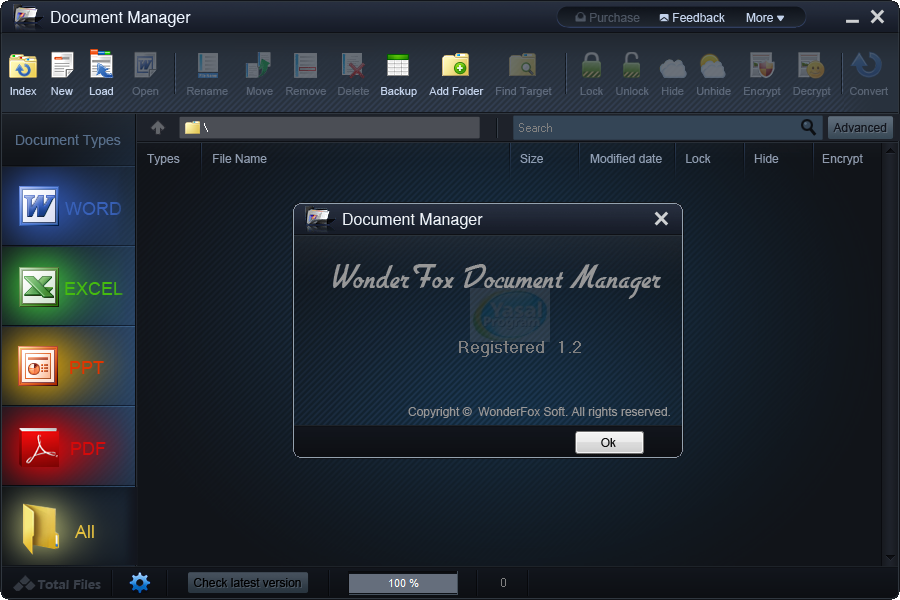 WonderFox Ducument Manager bir belge yönetimi programıdır ve bütün ofis belgelerinizi yönetmenizi sağlar. Günlük ofis belgelerini kolayca ve rahatlıkla tüm hedef dosya listelerinizi alarak belgelerinizi yedeklemenize imkân verir. WonderFox Ducument Manager, yalnızca bir belge / dosya yönetim yazılımı olmakla kalmaz, aynı zamanda bir dosya şifreleme yazılımı ve PDF dönüştürücüsüdür. Belgelerinizin korunmasına yardımcı olabilir, özel belgeler ve dosyalarınızı gizleyebilir ve şifreleyebilmektedir.