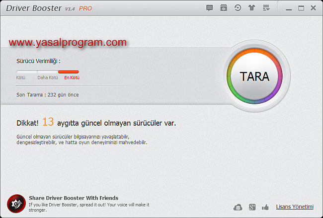 Advanced SystemCare Pro, bireysel tüketiciler için vazgeçilmez bir yazılım haline gelmiştir. Türkçe dil seçeneği mevcuttur. IObit Driver Booster PRO, donanım arızaları, uyumsuzluklar ve sistem çökmelerine karşı bilgisayarınızı korumak için doğru bir araçtır. Programın Türkçe dil desteği bulunmaktadır. Buradan ulaşacağınız facebook sayfasına giriş yaparak sizden istenilen işlemlere onay verin. Kampanya sayfasını beğenmeniz ve kendi profil sayfanızda paylaşmanız gerekiyor. Sayfadaki futbol topuna fareniz ile vuruş yaparak Advanced SystemCare 7 PRO veya Driver Booster PRO programlarından birini kazanıyorsunuz. Kampanya sayfasında programın indirme bağlantısı ve 6 aylık lisans anahtarı gözükecektir. Her iki programı da teker teker vuruş yaparak kazanabilirsiniz… Advanced SystemCare 7 PRO Fiyatı:$29.99 ——————————————————————- IObit Driver Booster PRO İndirme boyutu 15.7 MB XP, Vista, Windows 7 ve Windows 8 desteği (32 ve 64-bit) Fiyatı:$22.95