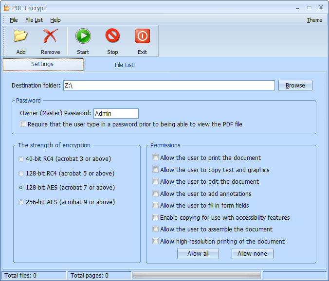 PDF Encrypt PDF belgeleri için tasarlanmış hızlı ve kolay kullanımlı toplu şifreleme programıdır. Yazılım 40-bit RC4, 128-bit RC4, 128 bit AES ve 256-bit AES şifreleme destekler. PDF belgeleri korumak için Parola ve izinleri (Yazdırma, kopyalama, ayıklama, değiştirme, düzenleme, vb) ayarlayabilirsiniz.