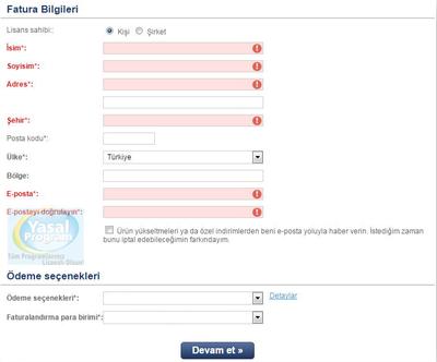 Fatura bilgileri bölümünde Ülke bilgisi de dahil olmak üzere kırmızı renkli bölümlere istenilen bilgileri girerek Devam et butonuna tıklayın ve işleme devam edin.