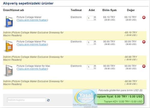 Seçtiğiniz ürünleri Alışveriş sepetinizdeki ürünler adı altında gösteren sayfa karşınıza gelecek. Burada dikkat etmeniz gereken ürünlerin altında gösterilen fiyat biriminin sıfır (ücretsiz) olması.