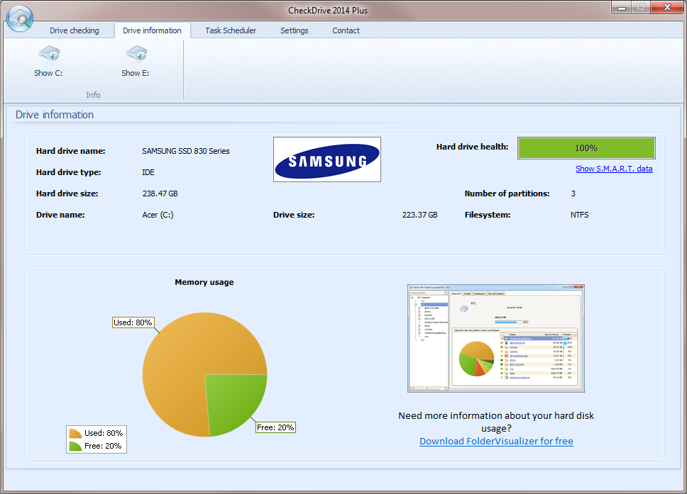 Check Drive 2014, sabit diskinizi denetler ve bir sorun bulursa sizi uyarır. Yazılım, diskinizde oluşabilecek sorunları denetleyerek ileride herhangi bir sistem çökmesi yaşanmadan sizi bilgilendirir ve uyarır. Program ile aynı zamanda küçük disk sorunlarını giderebilirsiniz. Diskinizi gözden geçirme işlemi istek üzerine otomatik olarak başlayabilir veya otomatik denetim için zamanlamayı ayarlayabilirsiniz. Program sadece geleneksel sabit diskleri değil aynı zamanda SSD diskleri de desteklemektedir.