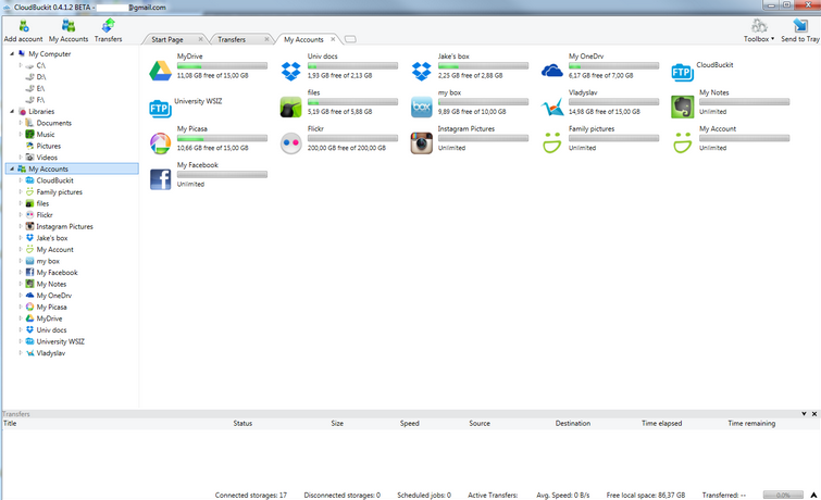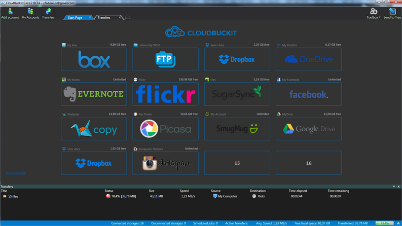 CloudBuckit, kullanıcı dostu ve üstün özelliklere sahip birden fazla bulut hizmetlerini kontrol etmenizi sağlayan bir yazılımdır. Tüm çoklu bulut hesap depolarının yanı sıra FTP bağlantıları ve transfer dosyalarını yönetmenizi sağlayan, oldukça güvenilir bir masaüstü uygulamasıdır. Arkadaşları ve ekipleri birbirine bağlayan ve güvenli, şifreli bulut dosya transferi sayesinde kolayca projelerinizin tamamlanmasını sağlar.