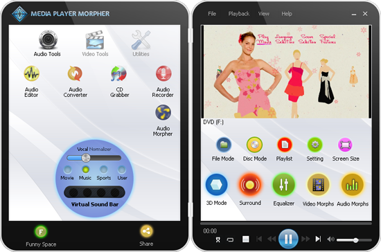 Media Player Morpher katlanabilir tabletlerdeki gibi büyük ve net ikonları, yapmak istediğiniz şeye yönlendiren arayüze sahip bir çoklu ortam oynatıcısıdır. Program tüm popüler ses ve video formatını destekleyen ve DVD oynatabilen bir araçtır.