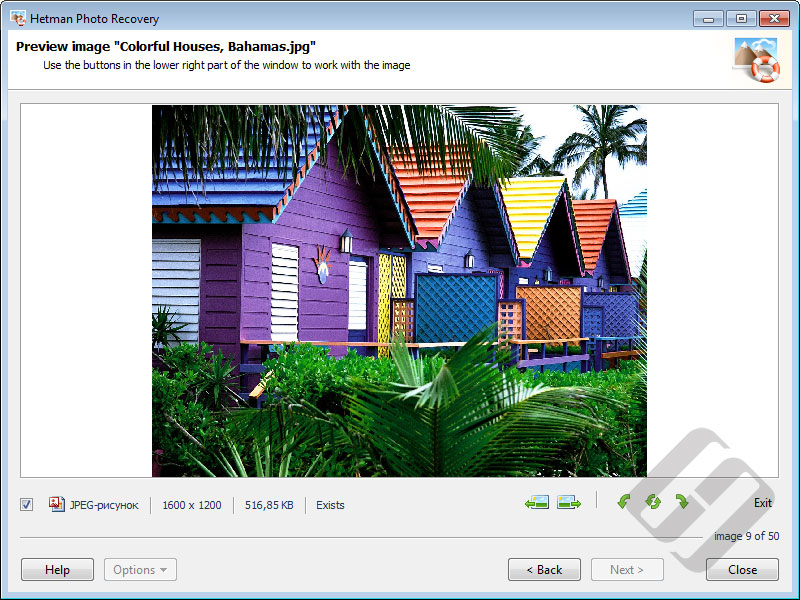 Hetman Photo Recovery, silinen resimlerin tam boyutlu önizlemesini gösteren yerleşik bir resim görüntüleyicisi ile geliyor. Geri kazanılabilir resimleri kolayca kurtarmak istediğinizde, görüntüleri seçmek için küçük resimler olarak görüntülenir. Böylece kurtarmak istediğiniz resimlerinizi görebilir ve istediklerinizi seçerek onları kurtarabilirsiniz.