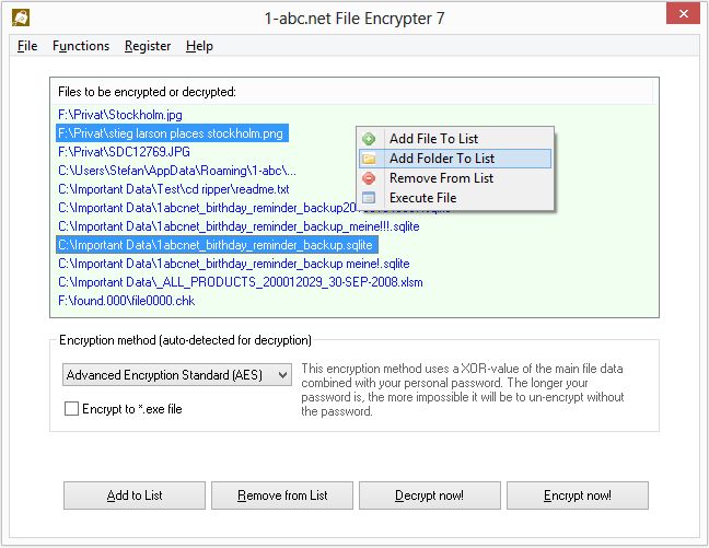 1-abc.net File Encrypter her çeşit dosyanızı kendi özel şifrenizle korur. 11 simetrik ve asimetrik şifreleme (AES gibi) mevcuttur ve hepsi birbiriyle kombinedir. Gizliliğinizi korumak için bu programı kullanabilirsiniz.