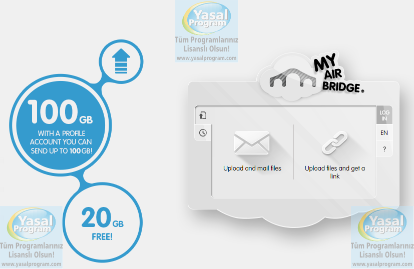 MyAirBridge ile ücretsiz olarak e-posta yoluyla 20 GB’a kadar veri gönderebilirsiniz. MyAirBridge herhangi bir zamanda, herkese, güvenli bir şekilde kolayca büyük miktarda (20 GB) veri göndermenizi sağlayan bir web servisidir. Birkaç adımda kendi profilinizi oluşturarak 7 gün boyunca ücretsiz olarak 100 GB’a kadar veri gönderebilirsiniz. Ücretsiz mail yolu ile 20 GB veri gönderme hakkına her zaman sahipsiniz…