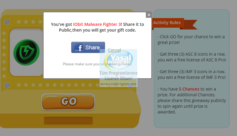 Buradan ulaşacağınız facebook sayfasına giriş yapın. Sayfadaki “Go” yazısını tıklayarak simgelerin dönmesini sağlayın. 3 aynı simgeyi de aynı sıraya getirerek yazılımların lisanslarına ücretsiz sahip olabilirsiniz. 5 defa deneme şansınıza sahipsiniz. Eğer 5 seferde hiçbir yazılımı kazanamazsanız kampanyayı arkadaşlarınızla paylaşarak tekrar oynama şansına sahipsiniz. Kampanya 24 Mart‘a kadar devam edecektir. Windows 2000/XP/Vista/7/8 IObit Malware Fighter 3 PRO 31.2MB Fiyatı: $19.95 Advanced SystemCare 8 PRO 30.7 MB Fiyatı:$19.99