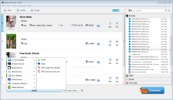 EPUB Converter, Windows için evrensel bir e-kitap dosyası dönüştürücüsüdür. Endüstri standardında e-kitap dosyalarını, PDF dosyalarını, orijinal desen ve kalite ile dönüştürmenizi sağlar. Dönüştürdüğünüz e-kitaplarınızı taşınabilir Apple cihazları, Amazon Kindle, Barnes&Noble Nook, Sony, Kobo, Google Play, Lulu, Smashwords, Fictionwise vb. gibi e-okuyucu tüm cihazlara yükleyerek okuyabilirsiniz.