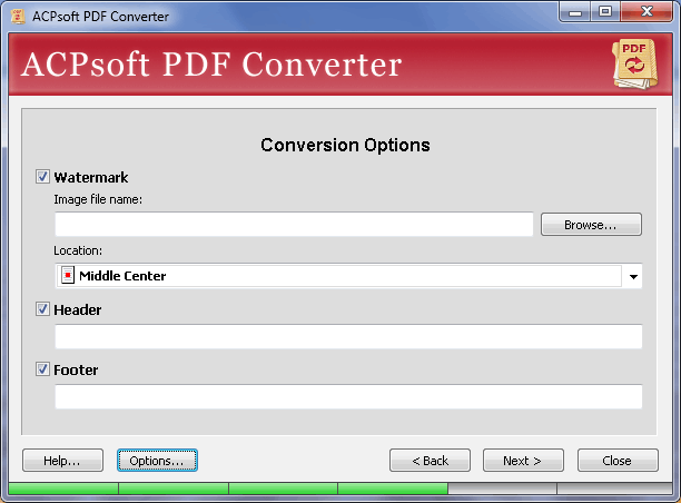 Program dönüştürülmüş PDF e filigran eklemeye , başlık ve altlık ilave etmeyi de sağlamaktadır.